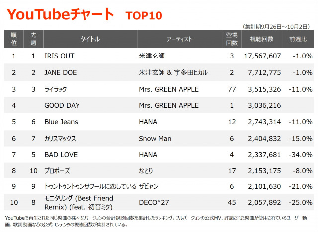 【YouTubeチャート】米津玄師、『チェンソーマン レゼ篇』主題歌「IRIS OUT」3週連続1位 エンディングテーマ「JANE DOE」2週連続2位