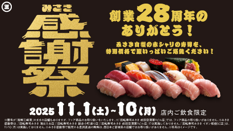 創業28周年記念『みさき感謝祭』開催!第一弾は「インドまぐろ超のりのり大とろ」が税込180円(税込)!第二弾は寿司全品10%OFFと超お得!