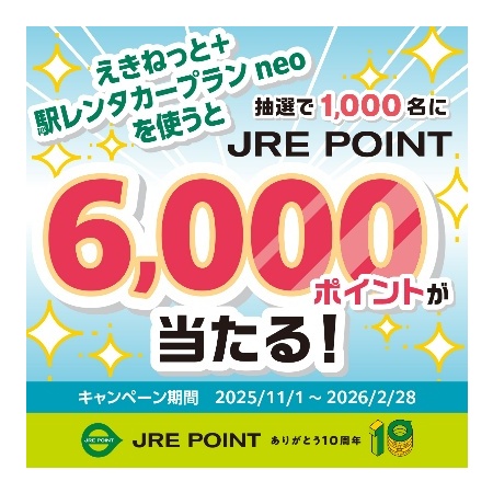 「えきねっと+駅レンタカープラン neo」を使おう!総勢1000名様にJRE POINT 6000ポイントが当たる抽選祭! 2025/10/31 14:00 - JR東日本レンタリース株式会社