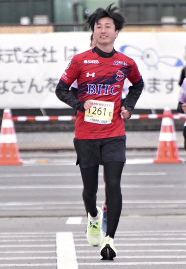 いわき市で2月23日に開かれたいわきサンシャインマラソンでフルマラソンを完走したいわきスポーツクラブの営業担当伊藤駿光(たかみつ)さん(25)。J1清水の下部組織や同志社大サッカー部で培った脚力を生かし、走ったスタッフ6人の中で最初にフィニッシュ地点に到着した。  ただ、初のフルマラソンは想像よりもきつかったようで「しばらくゆっくりします」と本音がこぼれた。
