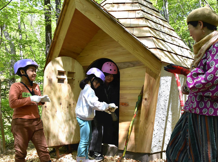 「こびとの森の探検あそび」と銘打つ体験プログラムでは、酒井さんや長女の実玖(みく)さん(23)らがガイドを担当。参加した市内外の小学生が敷地内に隠されている鍵を探し当て、こびとたちがすむ部屋の中の様子を探索した。まき割りや枝切りなどを通し、環境保全の大切さも味わった。