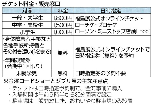 料金は一般・大学生1800円、中学・高校生1500円、小学生千円。各種手帳(身体障害者手帳、療育手帳、精神障害者保健福祉手帳、ミライロID)のある人と付き添い1人、県立美術館の年間観覧券の所持者、未就学児は無料。福島展公式オンラインチケット、ローソンチケットWEBのほか、ローソン・ミニストップ店頭「Loppi(ロッピー)」で販売する。