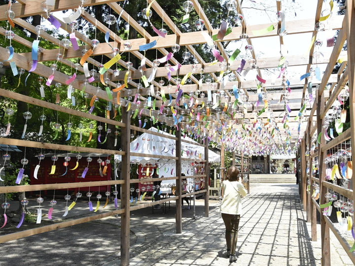 会津美里町の伊佐須美神社で1日、「第7回伊佐須美の杜(もり) 七夕祈願祭 御涼(おすずみ)風鈴」が始まった。表参道などに飾られた約3000個の風鈴が涼しげな音色を奏で、参拝者の心を癒やしている。8月24日まで。