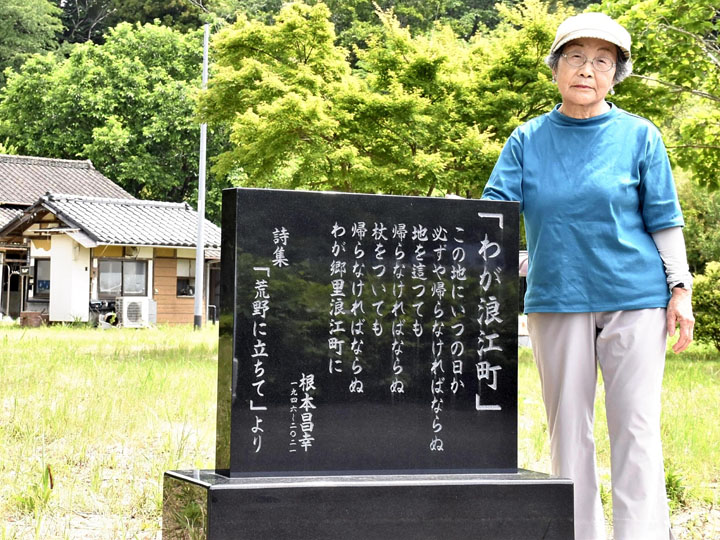 浪江町出身で詩人として活躍した故根本昌幸さんの妻洋子(ひろこ)さん(82)は、東京電力福島第1原発事故前に共に暮らしていた同町苅宿の自宅に昌幸さんの歌碑を建てた。歌碑には原発事故により、故郷に帰れないまま亡くなった昌幸さんの詩を刻んだ。洋子さんは「原発避難者の悲痛な叫びを代弁している。帰りたかった無念を残してあげたい」と歌碑にそっと手を添える。 この地にいつの日か 必ずや帰らなければならぬ 地...