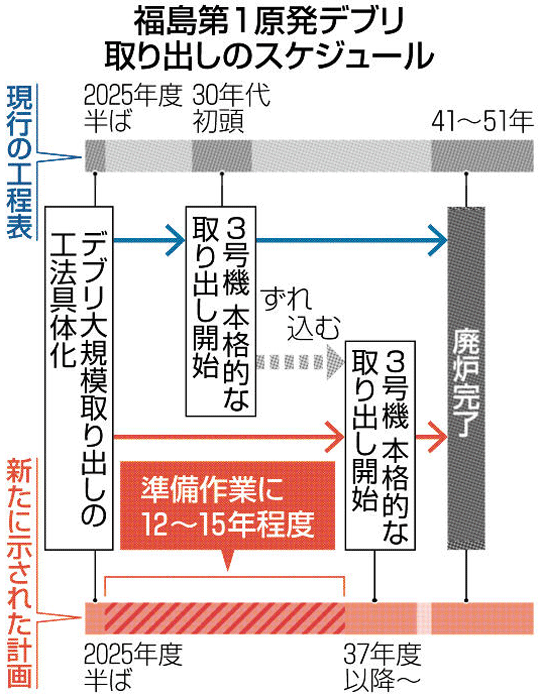 東電は、いずれの場合も準備期間が12~15年かかると見込んでおり、3号機からの取り出し着手は37~40年度にずれ込む見通しだ。