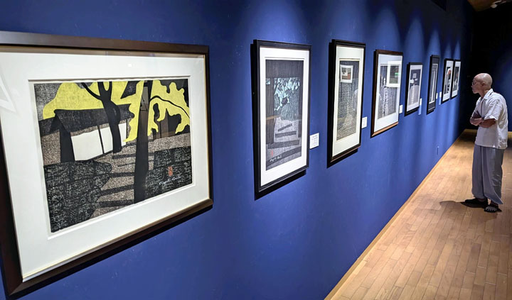 最初期の花の作品や、京都・奈良の寺院を表現した作品など約90点が並ぶ。松島さんの解説札も掲示した。同館は松島さんから斎藤清の作品99件の寄贈、寄託を受けており、期間を分けて展示する。