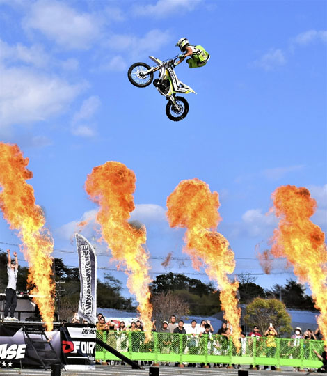 ショーには「広野夢大使」の鈴木大助さんらライダー5人が出演。バイク用ジャンプ台を使い、空中でハンドルから手を離したり、宙返りしたりする大技を披露した。観衆は次々と繰り広げられる妙技に歓声を上げた。
