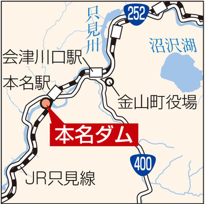奥会津・金山町本名を流れる只見川の水を満々とたたえる本名ダム。近くを走るJR只見線とともに、山あいの風景の一部となっている。