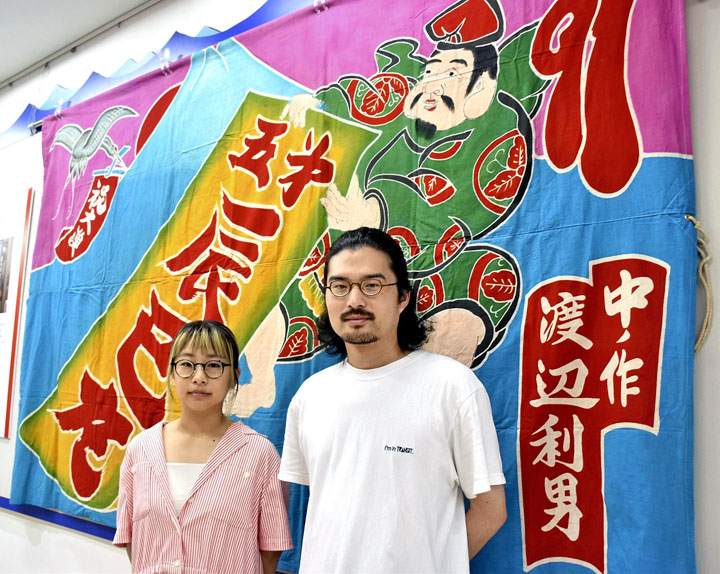 いわき市の江名地区地域おこし協力隊の野村史絵波(しえな)さん(30)と、夫で江名地区まちづくり協議会理事の隆文さん(32)が、同市の道の駅いわき・ら・ら・ミュウ2階で企画展「祝いの大漁旗展」を開いている。10月14日まで。