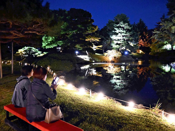会津若松市の国指定名勝・会津松平氏庭園「御薬園」。5日まで。紅葉時期に合わせて、園内をライトアップする。時間は午後5時30分~同8時(最終入園は同7時30分)で、時間内は入園無料。ワークショップや夜の呈茶メニューの販売もある。
