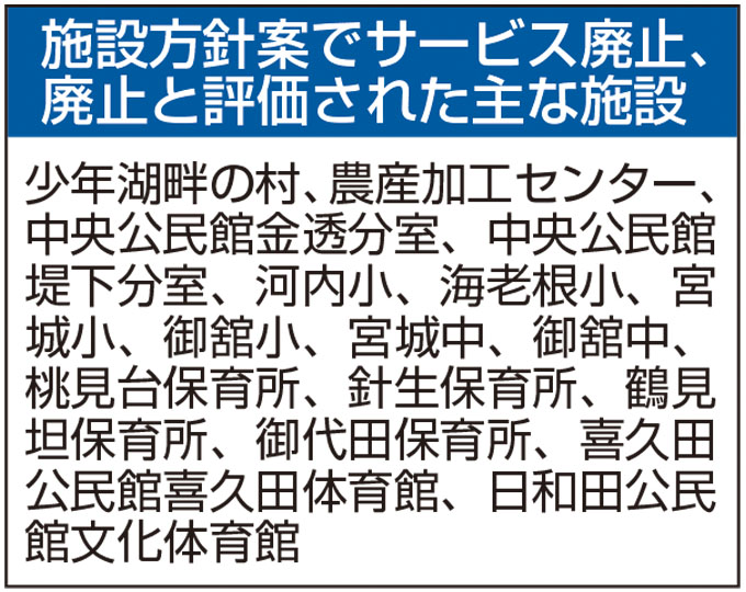 方針案で廃止に含まれた主な施設は【表】の通り。五つの区分のうち、建物の転用や譲渡などにより活用を検討するのは「サービス廃止」区分の39施設。建物の解体を検討するのは「廃止」区分の64施設だった。