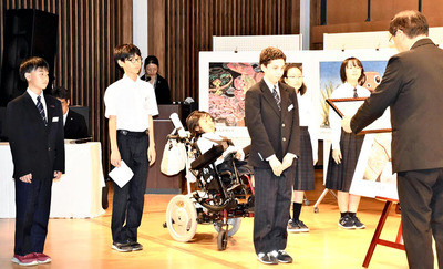式では寺木誠伸教育長が「会津の自然や文化、歴史の背景や知識を踏まえ、柔軟な感性で工夫してもらった」と述べ、共催した会津鶴ケ城を守る会の弓田八平理事長が「会津を一層好きになって全国に報告できる人になってほしい」とあいさつした。