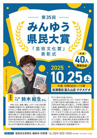 学術、文化、産業、福祉、スポーツなど各分野で顕著な活躍をされ、福島県民が栄誉とするにふさわしい業績、成果を上げられた個人、団体を顕彰する第35回みんゆう県民大賞「芸術文化賞」に輝いた郡山市出身の芥川賞作家・鈴木結生さんへの表彰式が25日午前10時30分から、岩瀬書店富久山店プラスゲオで行われます。
