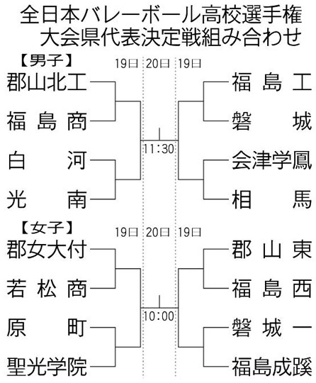 第78回全日本バレーボール高校選手権大会(春の高校バレー)の県代表決定戦・第53回FTV杯争奪県高校バレーボール選抜優勝大会の組み合わせ抽選会が23日、福島市で開かれ、対戦カードが決まった。 男女各8校が出場。男子は第1シードの郡山北工が福島商、第2シードの相馬が会津学鳳と対戦。女子は第1シードの郡女大付が若松商、第2シードの福島成蹊が磐城一と戦う。 大会は11月19、20の両日、同市の福島トヨ...