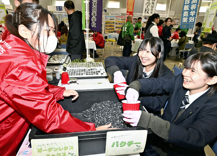 初日は全国から集った生徒たちが実習や研究の成果を紹介したほか、フラワーアレンジメントコンテストが開かれた。会場には県内の参加校がブースを出展し、園芸などの体験や実演で来場者を楽しませた。
