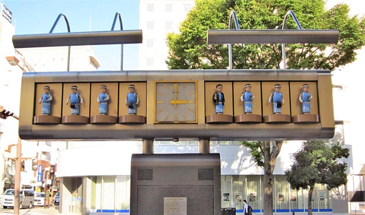 新盆の家を供養のために訪問する市の伝統芸能「じゃんがら念仏踊り」をテーマにした時計で、1992年に整備された。太鼓や鐘を持った8体の人形が2時間に1回、3分間のみ姿を現して演奏する仕掛けで、駅前に憩いの時間を届けていた。