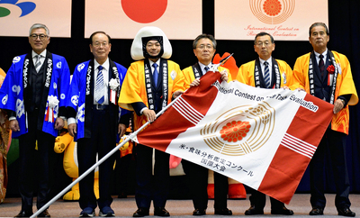 大会旗引き継ぎ式も行われ、次期開催地の福島県須賀川・岩瀬地区の首長らが出席。大寺正晃須賀川市長と木賊正男鏡石町長、添田勝幸天栄村長、丸山重一JA夢みなみ組合長らが登壇し、今大会実行委員長の小田川浩つくばみらい市長から、大会旗と”おにぎりのかぶり物”が引き継がれた。