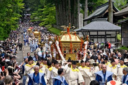 栃木県日光市の日光東照宮で18日、江戸時代から続く恒例行事「百物揃千人武者行列」が催された。晴天の中、徳川家康を祭ったみこしを中心に、よろいかぶと姿の武者らに扮した市民約1200人が参道を練り歩いた。外国人観光客をはじめ、大勢の見物客が参道脇からカメラを向けたり、みこしにさい銭を投げたりして楽しんだ。