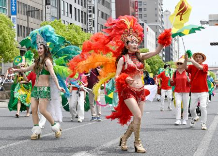 サンバやダンスのチームが神戸市中心部をパレードする第52回神戸まつりが18日開かれた。63団体、約4600人が大通りを行進し、きらびやかな衣装のダンサーらが軽快な踊りを披露。にぎやかな音楽が響き渡り、町を熱く盛り上げた。