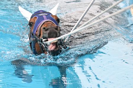 馬の温泉として知られる福島県いわき市の日本中央競馬会(JRA)競走馬リハビリテーションセンターで22日、プール開きがあり、けがで療養中の競走馬がレース復帰を目指して初泳ぎした。