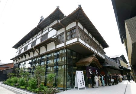 大正時代に建てられた旧歌舞練場の老朽化が進み、2022年7月から建て替え工事を進めていた。新歌舞練場は地上3階、地下2階建てで、建築家の隈研吾さんが監修。象徴的な大屋根のデザインなどは継承し、歴史の町並みになじむ外観とした。今年11月以降、芸舞妓の公演だけでなく、シンポジウムなどにも舞台や会議室を貸し出す。