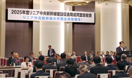 リニア中央新幹線沿線10都府県や経済団体などでつくる建設促進期成同盟会は28日、東京都内で総会を開き、品川―名古屋の開業時期の明示を求める決議を採択した。未着工の静岡工区は、関係自治体の理解を得ながら早期着手を図るよう要請した。