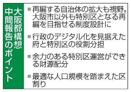 従来の都構想は、大阪市の24行政区を複数の特別区に再編する内容。中間報告は府内の小規模自治体について再編を求める声が上がっているとして、大阪市以外も特別区となる再編を目指せる制度設計を検討するとした。