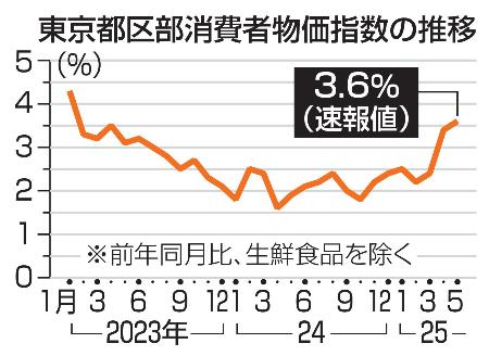 総務省が30日発表した5月の東京都区部の消費者物価指数(中旬速報値、2020年=100)は、値動きの大きい生鮮食品を除く総合指数が110・5となり、前年同月比3・6%上昇した。伸び率は3・4%だった4月から0・2ポイント拡大し、23年1月以来の高水準となった。コメ類などの食料の値上がりが物価を押し上げた。