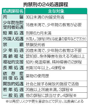 再編される処遇課程は、受刑者個々の特性に着目。70歳以上で認知症などを抱える「高齢福祉」、薬物依存の回復を目指す「依存症回復処遇」、知的・発達障害者ら向けの「福祉的支援」などとした。20歳以上26歳未満の「若年処遇」や刑期10年以上の「長期処遇」などは更生の意欲や再犯リスクに応じ3~4種類に細分化した。