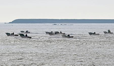 北方領土・歯舞群島の貝殻島周辺で3日、ロシア側に入漁料を払って行うコンブ漁が始まり、船団が出漁した。1日に解禁されたが悪天候で延期が続いていた。漁期は9月末までで、操業する船は183隻で過去最少。北海道根室市の歯舞漁協によると、高齢化や昨年の不漁の影響で出漁を断念する漁業者が多いという。