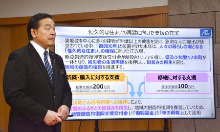 自宅を新築し購入する場合は、既存制度と合わせて約1千万円を支援する。民間の賃貸住宅を建設する場合は、業者に資金援助する。記者会見した馳浩知事は「出て行った皆さんの故郷が能登というのは変わらない。帰りたくなる町づくりを推進したい」と述べた。