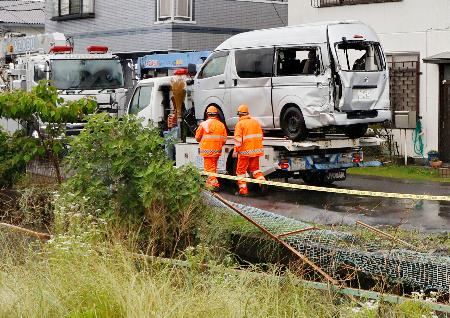 現場はJR東川口駅から北東約2キロの住宅や畑が広がる地域。落下した送迎車は窓ガラスが割れ、後部が大きくへこみ、レッカー車で運ばれた。