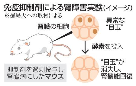 免疫が自分の体を攻撃する自己免疫疾患で、治療に使われる免疫抑制剤で問題とされる副作用の急性腎障害は、腎臓細胞の中に“目玉”のような異常な構造ができることが原因だと、徳島大のチームが5日までに米医学誌に発表した。