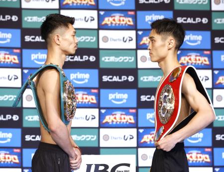 計量後は約15秒間にらみ合った。下馬評では中谷優位との声が多い。中谷は「体調はいい。あとはしっかりと気持ちをつくって、期待を上回る試合を見せたい」と話し、西田は「周りの声は全然気にしていない。自分を信じてくれる人のために闘う。自信はある」と気合十分に語った。