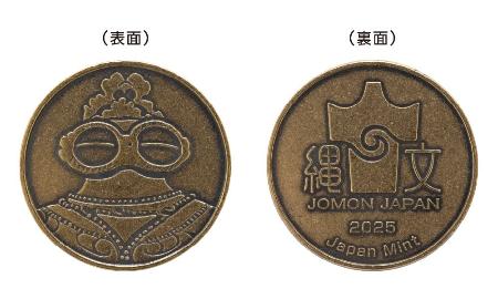 青森県の亀ケ岡石器時代遺跡から出土した国の重要文化財「遮光器土偶」がデザインされた丹銅製の記念メダルを、今年製造の貨幣6種類と特製ケースに納めたセットは限定2万5千個で2800円。