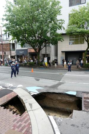 現場は通称・国体道路と呼ばれ、飲食店などが立ち並ぶ一角。近くのリサイクルショップに勤める男性は「午前10時ごろに穴が開いてるのが見え、30分ほど後には倍の大きさになっていた」と話した。