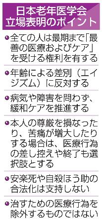 日本老年医学会は27日、人生の最終段階における医療やケアの基本的な見解をまとめた「立場表明」を改定したと発表した。改定は2012年以来となる。75歳以上の人が2千万人を超える中「全ての人は最期まで『最善の医療およびケア』を受ける権利を有する」と主張。病気や障害を問わず「緩和ケアを一層推進する」とし、医療やケアの選択は「本人の満足」を基準にすべきだと訴えた。