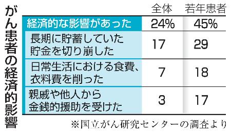 18~39歳の若年がん患者の45%が、生活に何らかの経済的影響を受けたことが、国立がん研究センターが3日公表した実態調査で明らかになった。がん患者全体の24%と比べ高い割合。調査を担当した元センター医療政策部長の東尚弘東京大教授は「若年患者は困難や孤立感を感じている人が特に多く支援が必要だ」と指摘した。