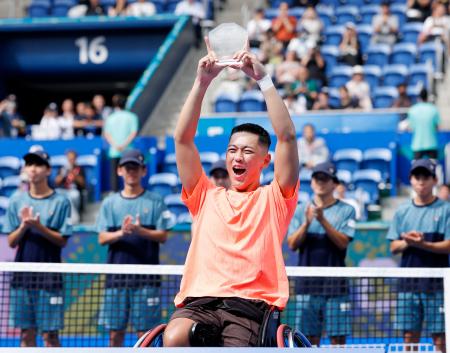 男子テニスの木下グループ・ジャパン・オープン第6日は29日、東京・有明テニスの森公園で行われ、車いすの部シングルス決勝で19歳の小田凱人(東海理化)が荒井大輔(BNPパリバ)に6―0、6―0で完勝し、3連覇を達成した。