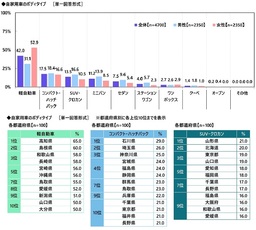 TOP3に挙がったボディタイプについて、都道府県別にみると、「軽自動車」では1位は高知県(65.0%)、2位は島根県(60.0%)、3位は和歌山県と長崎県(いずれも58.0%)、「コンパクト・ハッチバック」では1位は石川県(29.0%)、2位は埼玉県(26.0%)、3位は神奈川県(25.0%)、「SUV・クロカン」では1位は山形県(21.0%)、2位は北海道(20.0%)、3位は東京都と山口県(いずれも19.0%)でした。