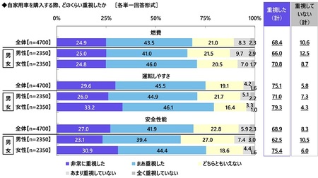 機能面についても聞いたところ、≪燃費≫では『重視した(計)』は68.4%、≪運転しやすさ≫では『重視した(計)』は75.1%、≪安全性能≫では『重視した(計)』は68.9%となりました。