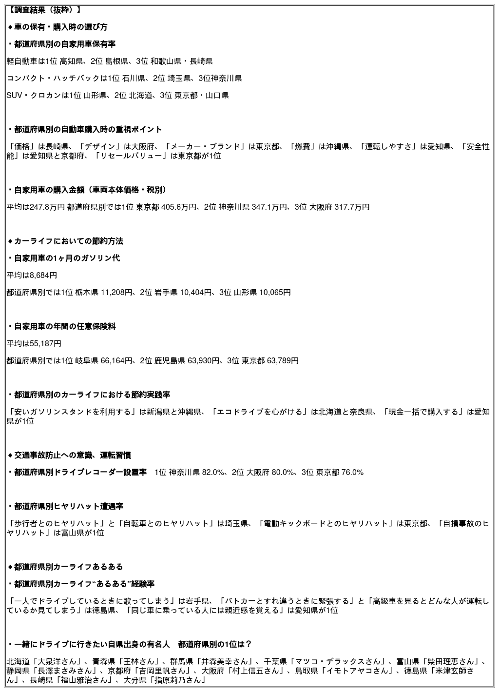 また、≪燃費≫では1位は沖縄県(81.0%)、2位は愛知県(78.0%)、3位は長崎県(76.0%)、≪運転しやすさ≫では1位は愛知県(89.0%)、2位は神奈川県・兵庫県・奈良県(いずれも85.0%)、≪安全性能≫では1位は愛知県と京都府(いずれも79.0%)、3位は千葉県と東京都(いずれも78.0%)、≪リセールバリュー(売却する際の価格)≫では1位は東京都(43.0%)、2位は大阪府(40.0%)、3位は神奈川県(36.0%)となりました。