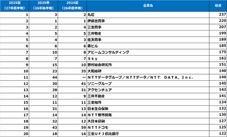 伊藤忠商事が前半戦調査で7年連続1位となったほか、三井物産(2位)、丸紅(3位)、住友商事(4位)、三菱商事(5位)と総合商社がトップ5を独占しました。