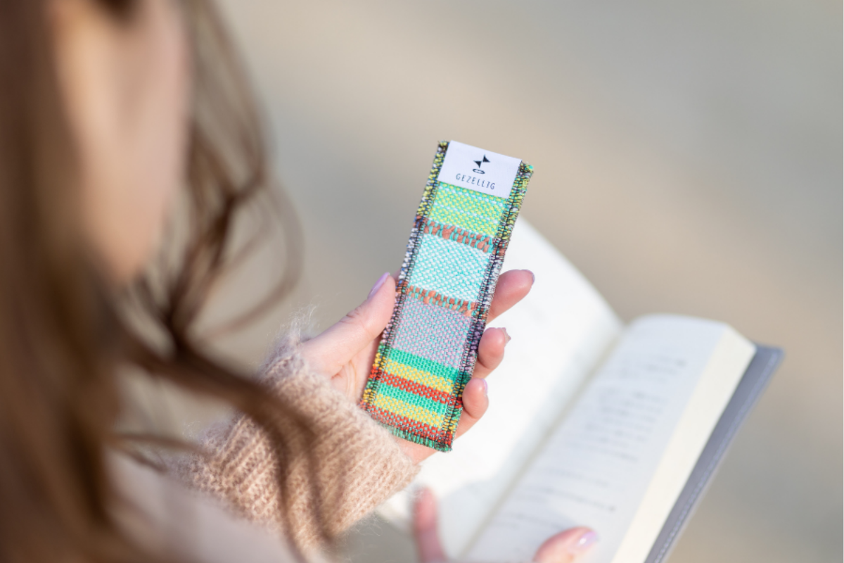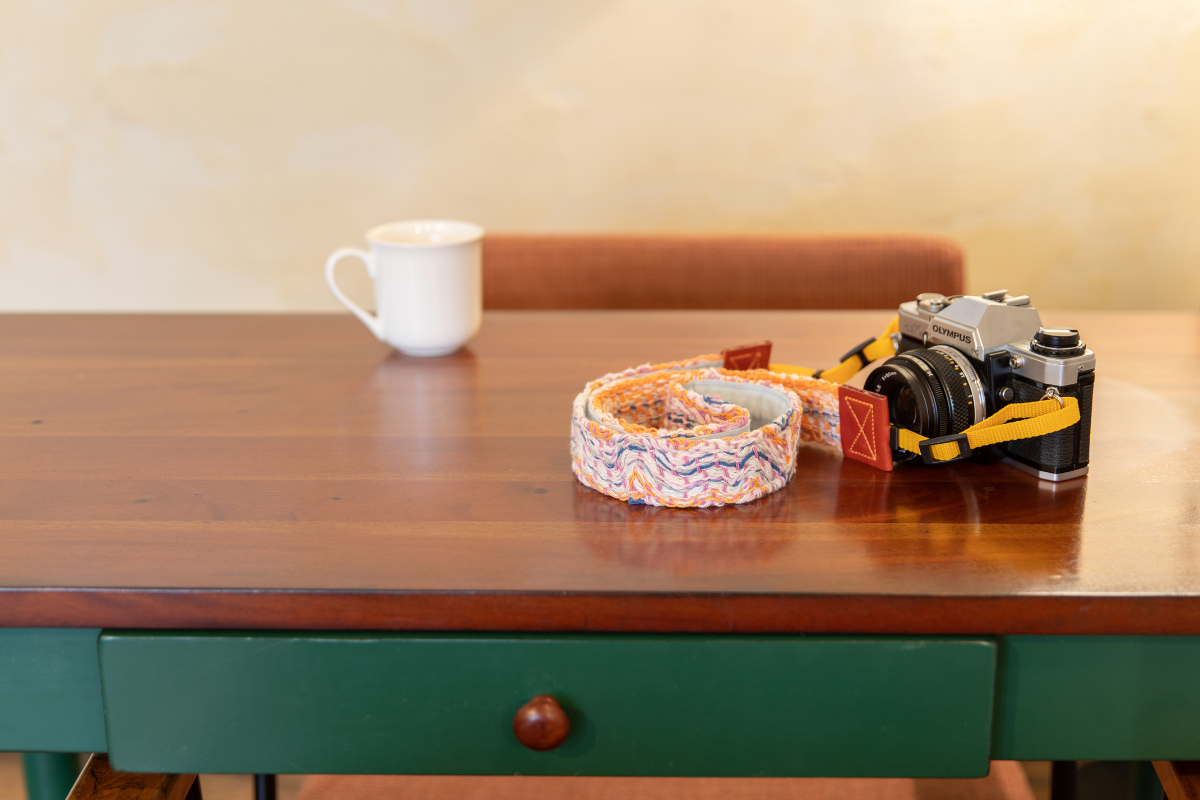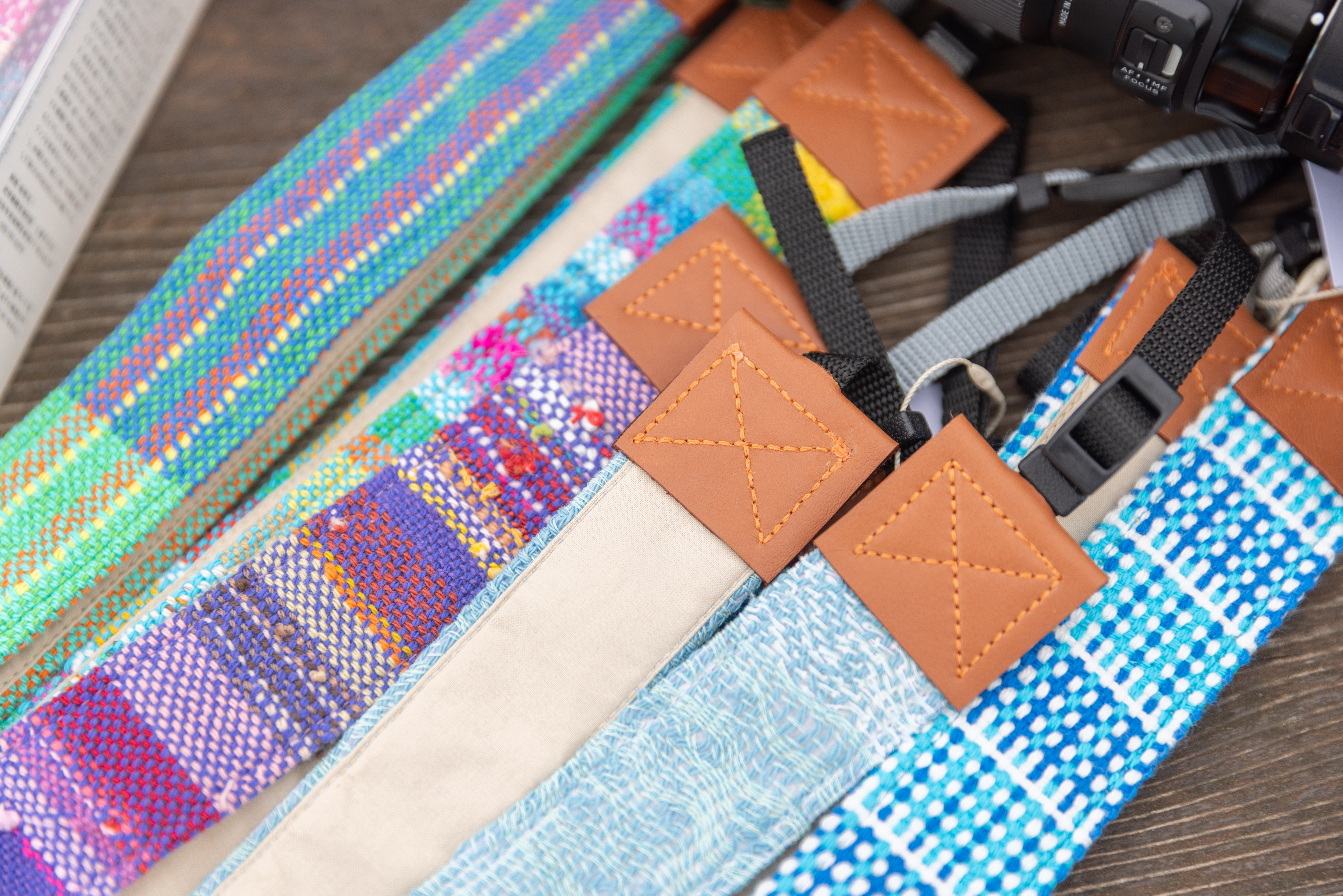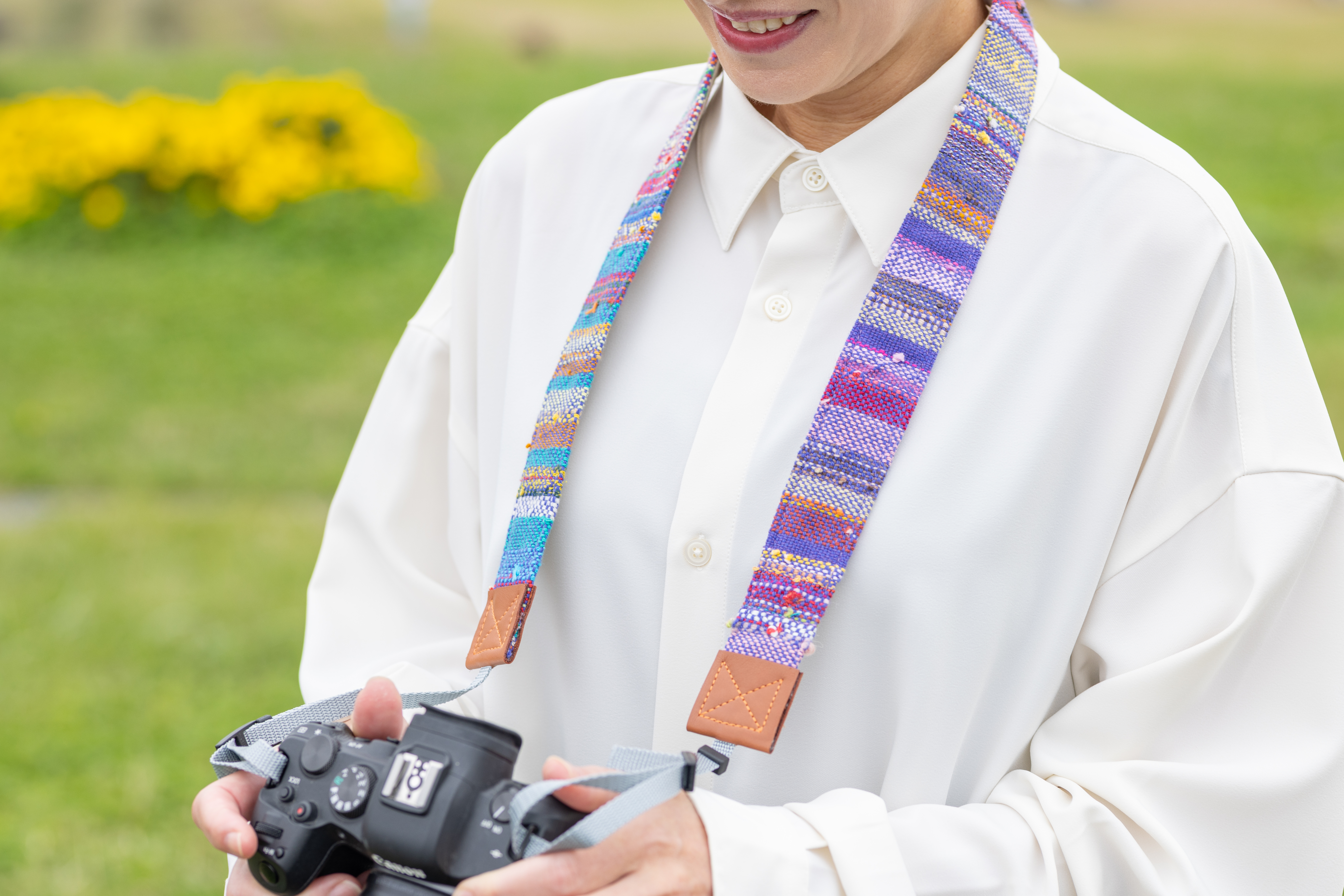 「GEZELLIG(ヘゼリヒ)カメラストラップ」は、精神障害や知的障害のある利用者の手仕事から生まれます。利用者が織り上げる布は、色も模様も一つとして同じものがなく、すべてが世界に一つだけの作品です。オランダ語で「心地よさ」を意味する「GEZELLIG」の名の通り、持ち主に快適な使い心地と温もりを届けます。