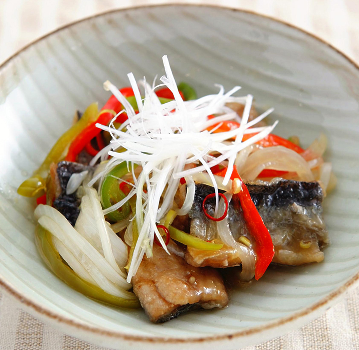 1人分434キロカロリー、塩分1.8グラム (1)2人分でサンマ2匹、片栗粉大さじ1、玉ネギ40グラム、ピーマン1個、赤ピーマン1/2個、A(酢50cc、水10cc、きび砂糖小さじ4、塩小さじ1/4、しょうゆ小さじ1/2、輪切りの赤唐辛子4切れ)、白ネギ20グラムを用意します。 (2)サンマは洗って二枚、または三枚におろし、半身を3等分に切り、塩少々を振ります。玉ネギは根元を除き、繊維に沿った...