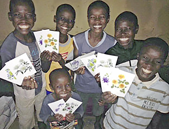 「他の国の子どもたちが日本の花を見たらどう感じるのだろう」 雑談の中で繰り広げられた何げないやりとりは、知人の尽力によって人から人へとつながり、アフリカまで届いた。2013年11月、私はギニア出身でギニア大使館員の経歴を持つタレントのオスマン・サンコンさんを通じて、アフリカの子どもたちに福島の花の作品とポストカードを贈った。 作品の贈呈から数カ月後、私の元にポストカードを手にした子どもたちの写真...