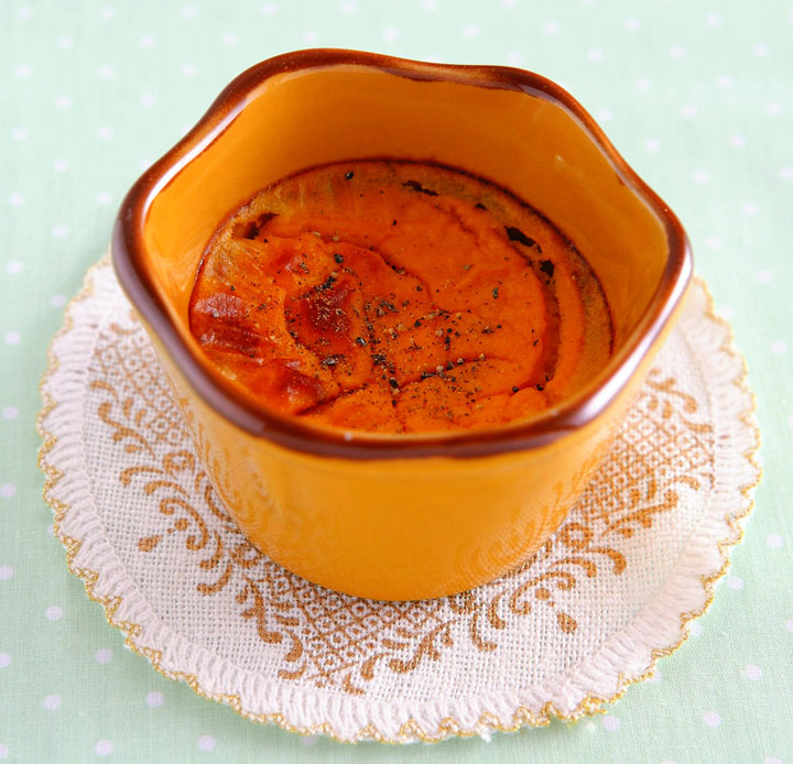 1人分104キロカロリー、塩分0.6グラム(1)2人分でニンジン120グラム、バター5グラム、顆粒(かりゅう)コンソメ小さじ1/4、クリームチーズ30グラム、溶き卵1/2個分を用意します。(2)ニンジンは皮をむいて薄切りにします。クリームチーズは室温に戻します。オーブンを200度に予熱します。(3)鍋にバターを入れて熱し、半分溶けたらニンジンと塩少々を加えて5分ほど炒めます。水100ccとコンソメ...