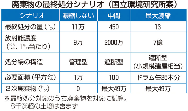 東京電力福島第1原発事故後の除染で出た廃棄物の最終処分を巡り、国立環境研究所が実現可能な技術的選択肢を検討し、3案にまとめたことが10日、分かった。最終処分対象物の放射能濃度は1キロ当たり9万~7億ベクレルで、濃縮して体積を減らす「減容化」を最大限実施した場合、廃棄物量は13トン(ドラム缶25本分)と小規模になる。環境省は20日にも最終処分の考え方を公表する方向で調整しており、この研究成果を参考...