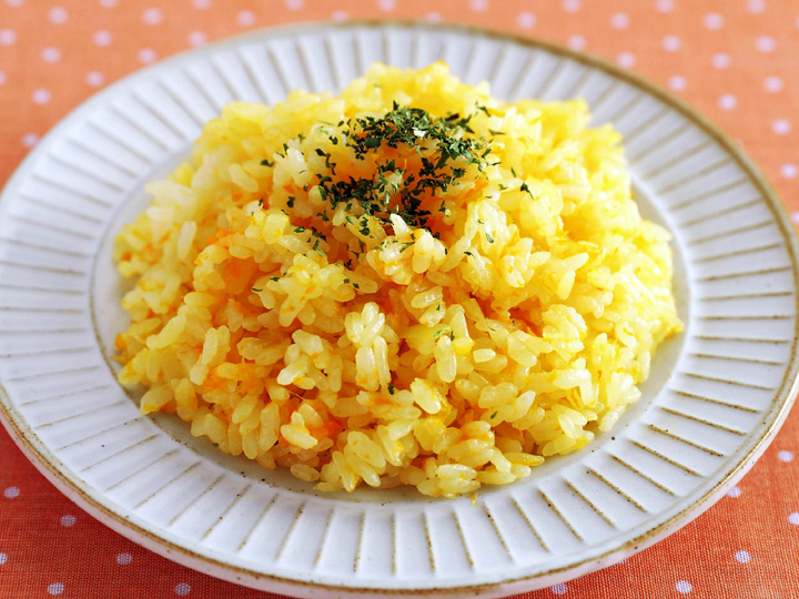 1人分214キロカロリー、塩分1.1グラム(1)2人分で無洗米120cc、コンソメ顆粒(かりゅう)小さじ1/2、ニンジンと玉ネギ各30グラム、バター5グラム、乾燥パセリ少々を用意します。(2)米は30分吸水した後、水気を切ります。ニンジンはすりおろし、玉ネギはみじん切りにします。(3)鍋に米、水120cc、コンソメ、塩小さじ1/4、ニンジンを入れてひとまぜし、表面を平らにならします。玉ネギとバター...