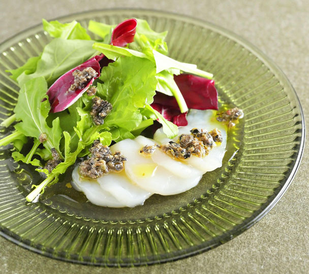 1人分166キロカロリー、塩分1.6グラム (1)2人分で刺し身用のホタテ貝柱4個、トレビスとルッコラ各30グラム、A(種なしブラックオリーブ20グラム、ケーパー4グラム、アンチョビーペースト6グラム、おろしニンニク4グラム、塩小さじ1/4)、エキストラバージンオリーブ油大さじ2を用意します。 (2)ホタテは余分な水気を除いて厚みを半分に切り、それぞれさらに半分のそぎ切りにします。トレビスは食...